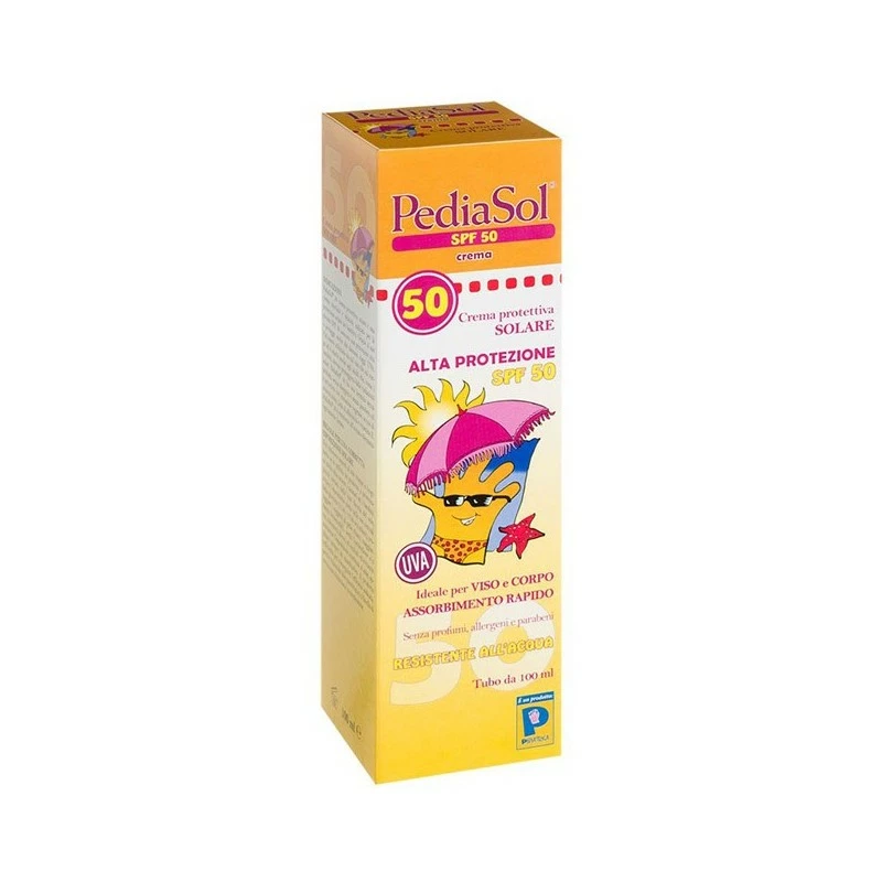Crema protettiva solare per bambini ad alta protezione. Può essere utilizzata sia sul viso che sul corpo ed è adatta anche per adulti. Prodotto ad assorbimento rapido e resistente all’acqua. PediaSol SPF50 crema contiene: filtri solari UVA e UVB, melanina vegetale, acqua di arancio dolce, latte di albicocca, vitamina E. Prodotto senza profumi, senza allergeni e senza parabeni.